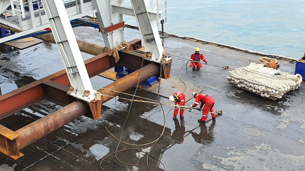 Careful pre-study was required to determine the reach of the boom lift, remaining space on the barge deck for boom manoeuvring, size of the lift basket for 2 workers and the physical strength of the workers to lift each shackle-hook manually.